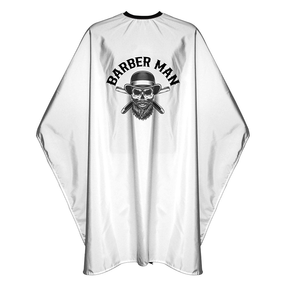 Berber Önlüğü Penuar Taffeta Kumaş Beyaz Renk Barber Kurukafa Baskılı Tıraş Saç Kesim Önlüğü